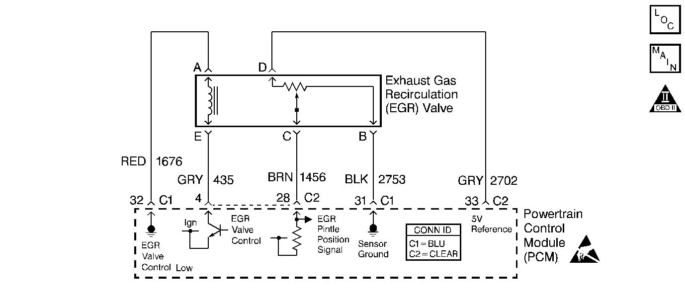 | • | Damaged harness--Inspect the wiring harness for damage. If the wiring appears to be OK, connect a DMM and check the circuit continuity while moving connectors and wiring harnesses related to the EGR valve. A change in the DMM display will indicate the location of the malfunction. |