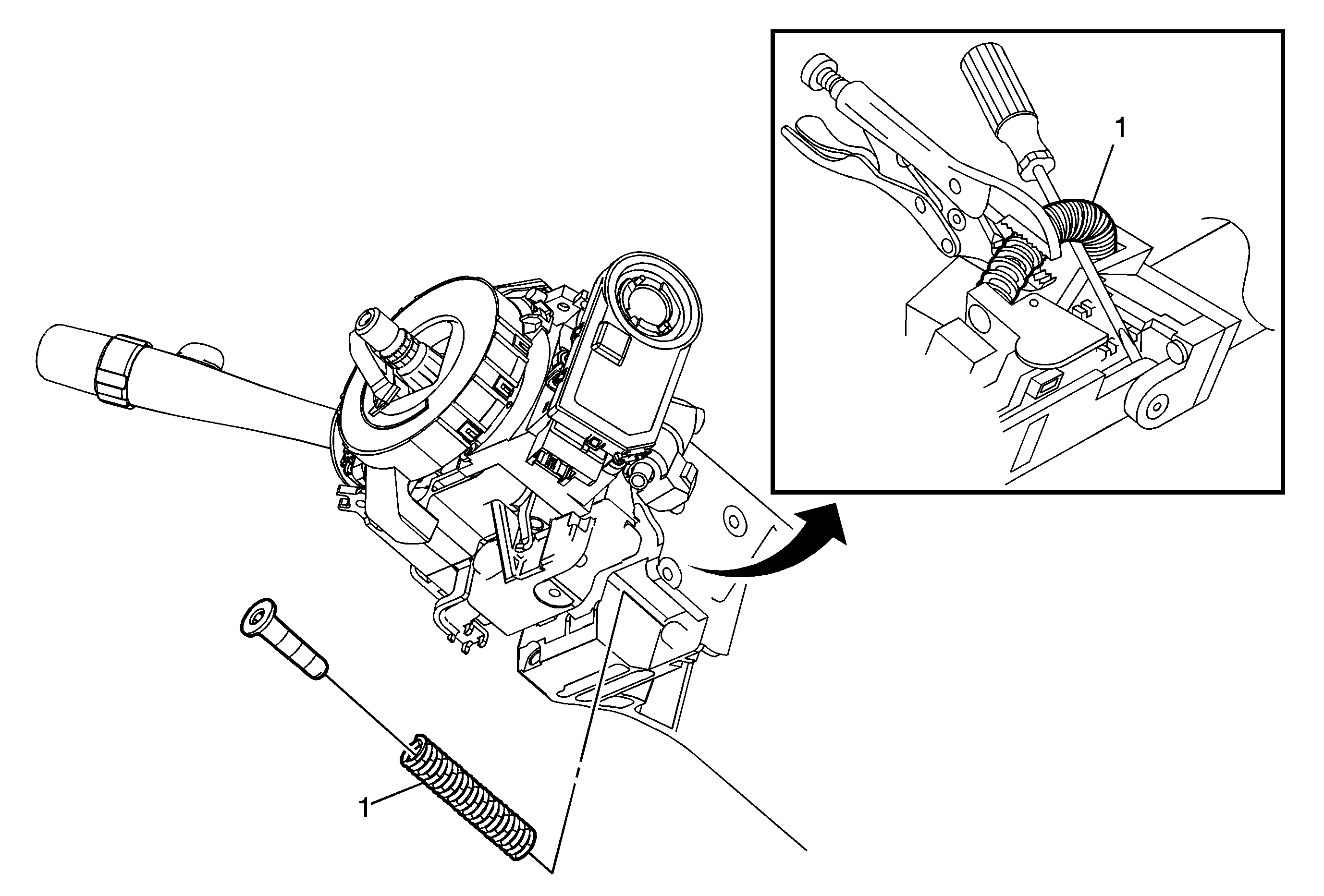 1 | Steering Column Tilt Spring Caution: The tilt spring and the spring guide are under pressure. The tilt spring and the spring guide may become a projectile. Secure the spring with locking pliers during removal. Secure the spring with locking pliers during installation. Bodily injury may result during removal and installation of the tilt spring and the spring guide. Always use caution during removal and installation of the tilt spring and the spring guide. Procedure