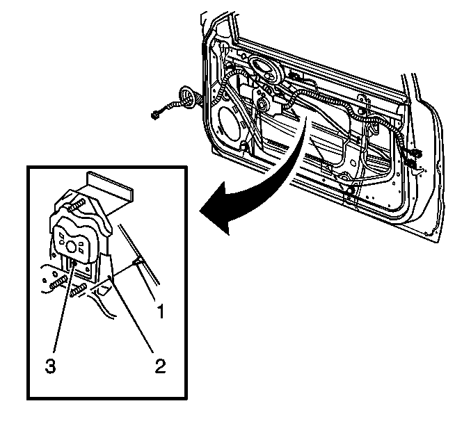 1. Partially install the three bolts (2) to hang the regulator in the door.