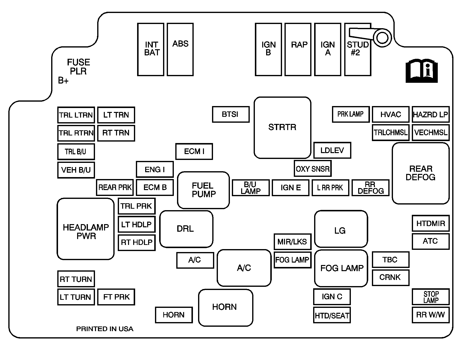The engine compartment fuse block is located under the hood on the driver's side of the vehicle. See Engine Compartment Overview for more information on location.