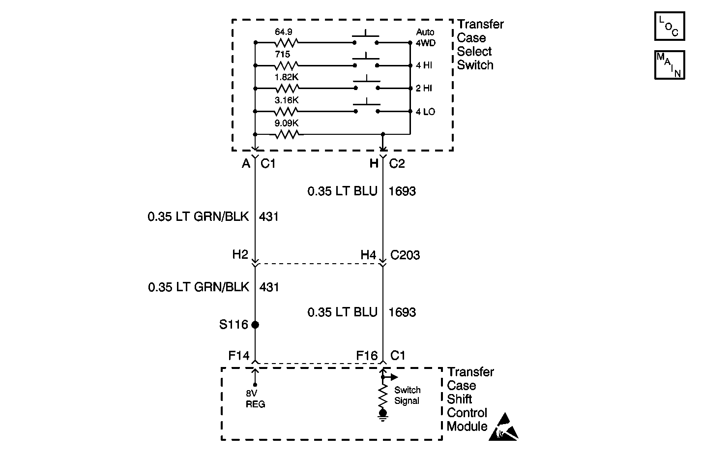 The range/mode switch circuit consists of four normally open switches. The transfer case shift control module supplies a regulated 8 volts, DC to the switch through the 8 V Reg circuit. The current travel through a 9.09 K ohms resistor located inside the switch. Then returns current to the transfer case shift control module through the switch signal circuit.