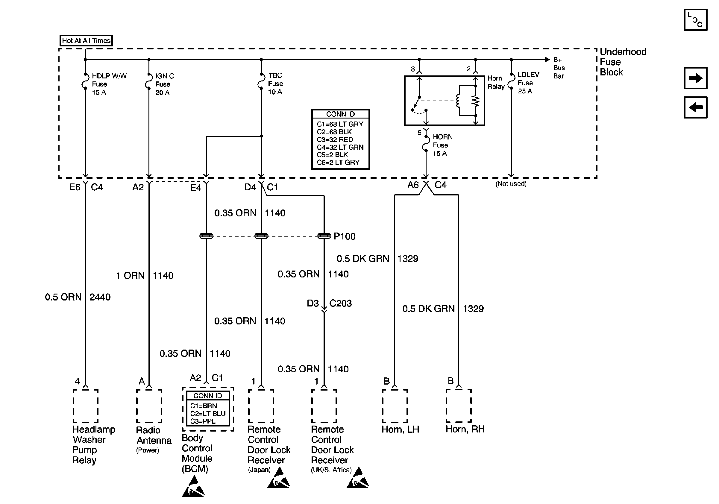 HDLP W/W, IGN C, TBC, LDLEV, and HORN Fuses