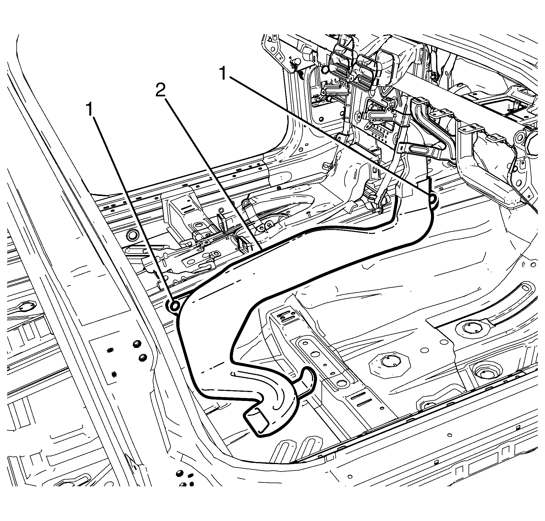 Disconnect the rear floor air outlet duct (1) from the HVAC module assembly (2).