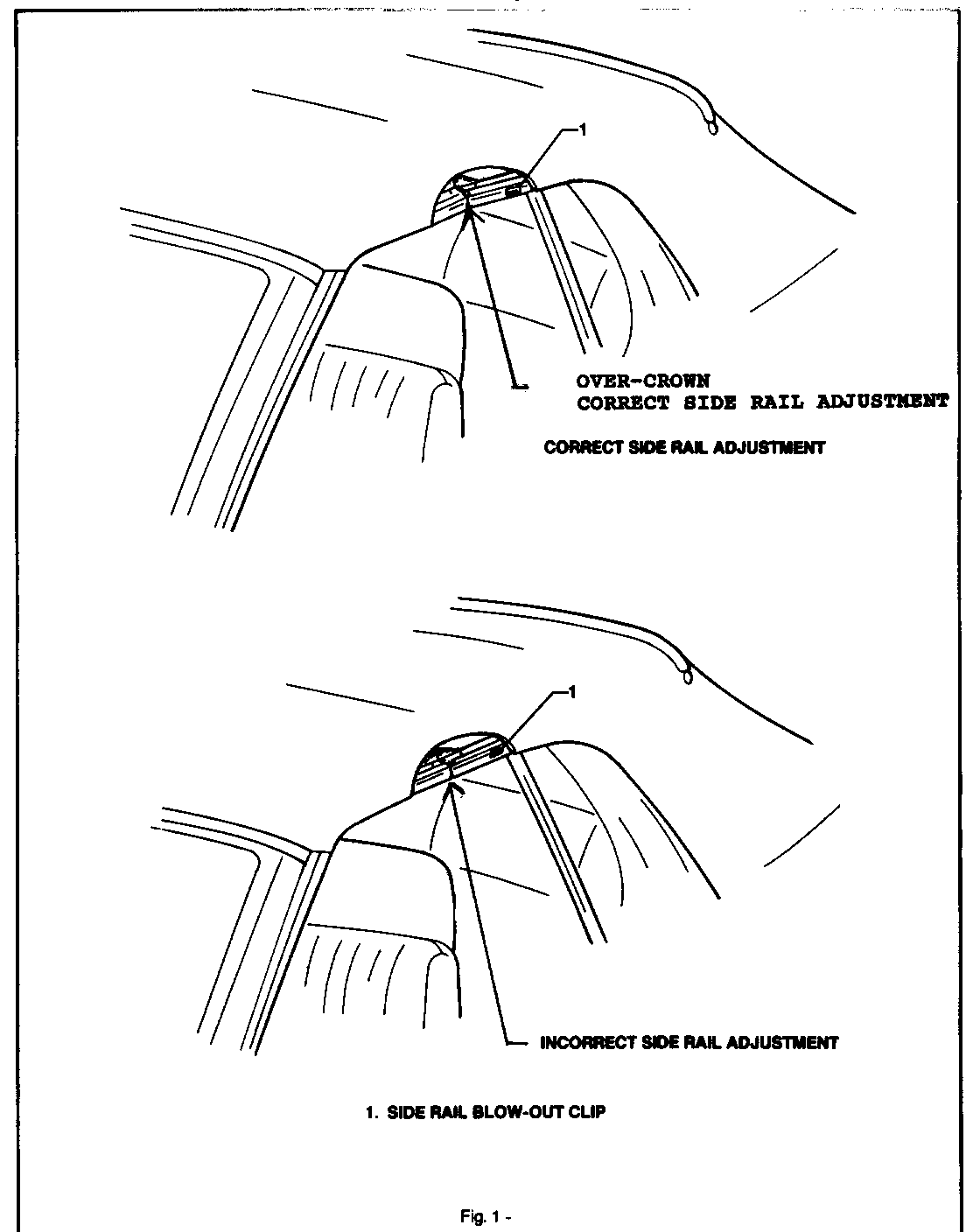 1. With top latched to windshield header and door glass in full up position, top side rails must exhibit a slight over-crown relation to top edge of door glass.