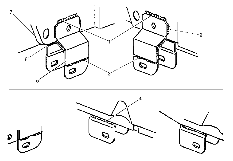 WHEN REPAIRING THIS WELD, GRIND OUT WELD ONLY, USING A SUITABLE TOOL SUCH AS A BURR MANDREL, CUTOFF WHEEL OR EQUIVALENT. RE-WELD THE ENTIRE LENGTH OF THE LOWER EDGE OF THE BRACKET.