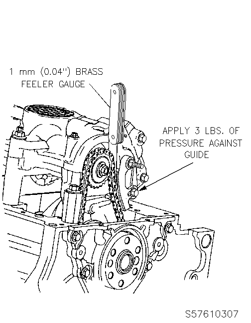 4. BALANCE SHAFT DRIVEN SPROCKET BOLT (153) FINGER TIGHT, REFER TO FIGURE 5. 5. INSTALL BALANCE SHAFT CHAIN GUIDE, REFER TO FIGURE 6. 6. PRESS CHAIN GUIDE TIGHTLY AGAINST THE CHAIN. 7. TIGHTEN CHAIN TENSIONER FASTENER (136). TIGHTEN BOLT TO 13 N.M (115 LBS. IN.). 8. TIGHTEN THE BALANCE SHAFT DRIVEN SPROCKET BOLT. TIGHTEN BOLT TO 40 N.M (30 LBS. FT.) PLUS ROTATE HOUSING DEGREES. 9. REMOVE TOOL J 41088 FROM BALANCE SHAFT HOUSING ASSEMBLY. 10. LOOSEN BALANCE SHAFT CHAIN GUIDE BOLT (136) AND ADJUST THE BALANCE SHAFT DRIVE CHAIN TENSION. BALANCE SHAFT DRIVE CHAIN TENSION, REFER TO FIGURE 7. ADJUST A. INSERTING A 1 MM (.040 IN.) BRASS FEELER GAGE BETWEEN THE CHAIN GUIDE AND THE CHAIN.