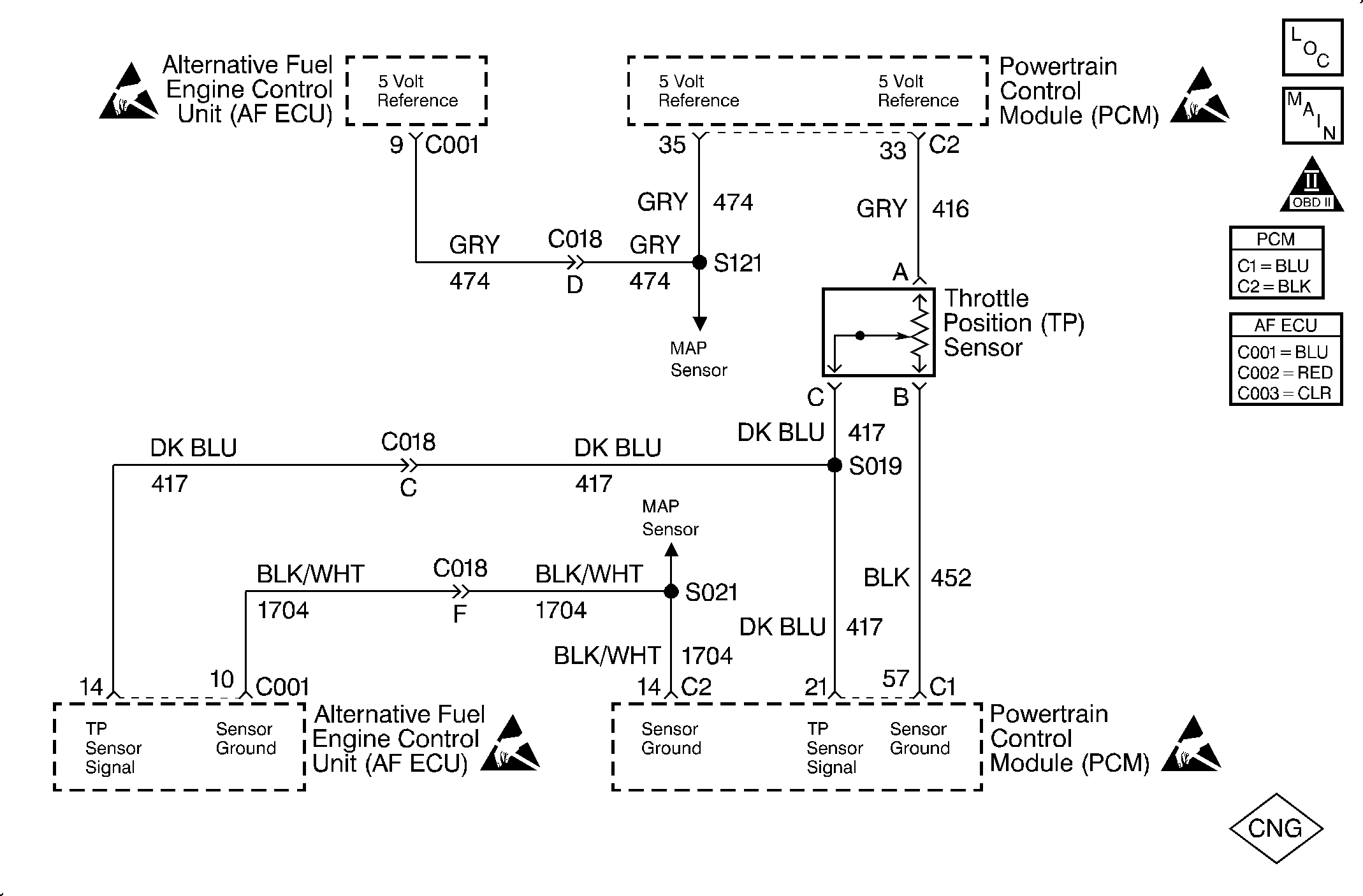 6 | Inspect the TP sensor connector and connector C018 for damaged or bent pins and corrosion. Was a problem found? | -- | Go to Step 8 | Go to Step 7 |