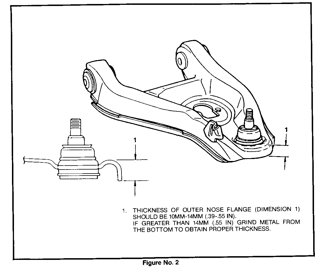 11. Inspect the outer nose of the control arm for the flange thickness. The thickness should be 10 mm - 14 mm (.39-.55 inches). (Figure No. 2)