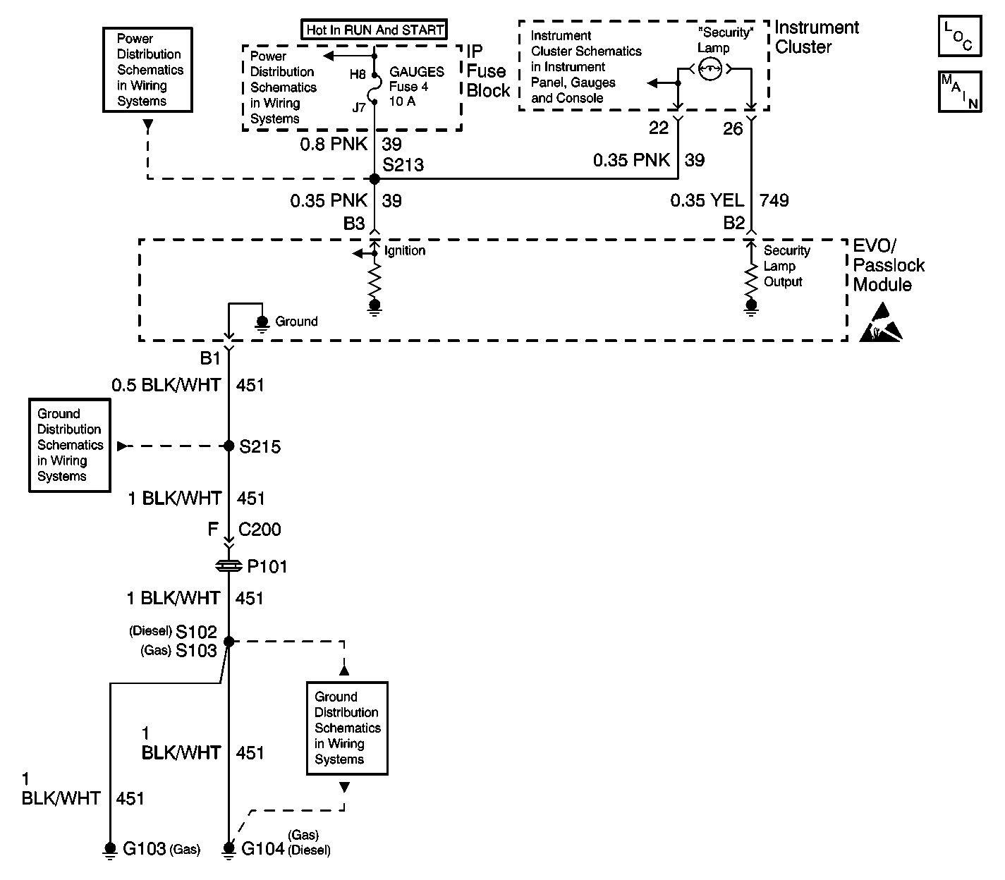 | • | The security indicator may be on when the ignition switch is OFF if CKT 749 is shorted to battery power. |