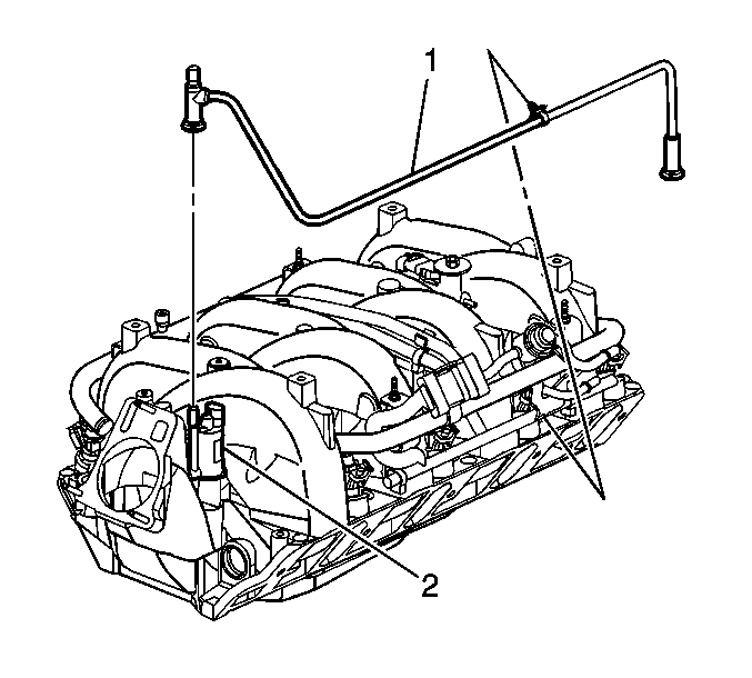 | • | Connect the EVAP purge pipe (1) to the EVAP canister purge valve (2). |
