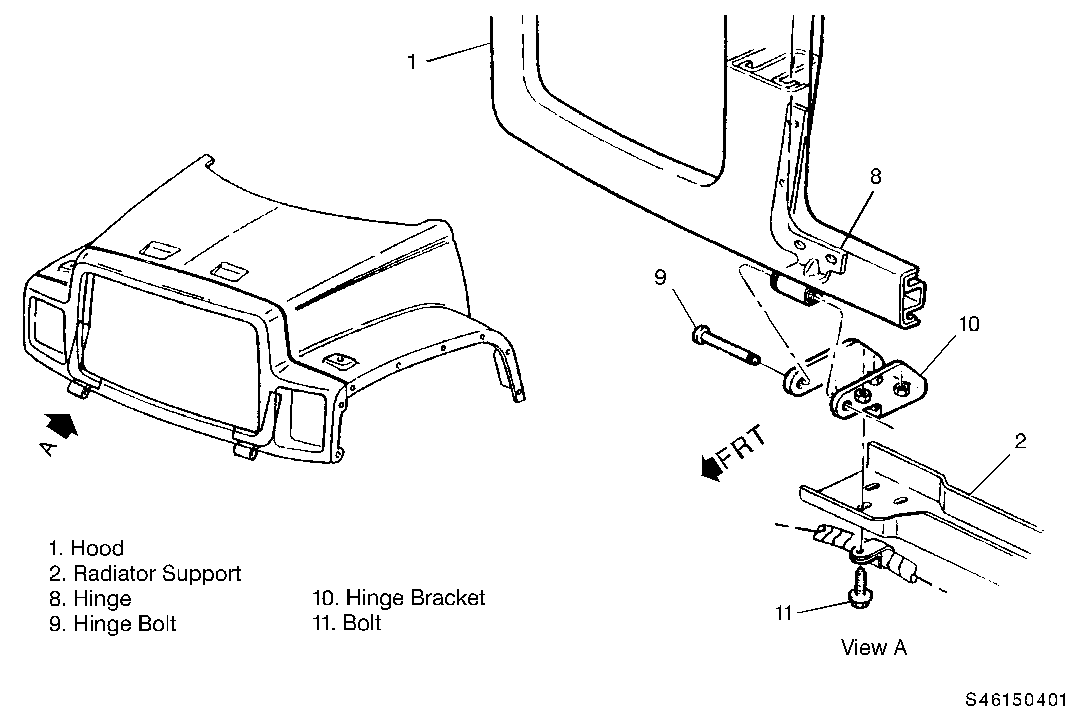 3. LOOSEN 4 BOLTS PER SIDE ON HINGE BRACKET #10 (FIGURE 1, VIEW A).