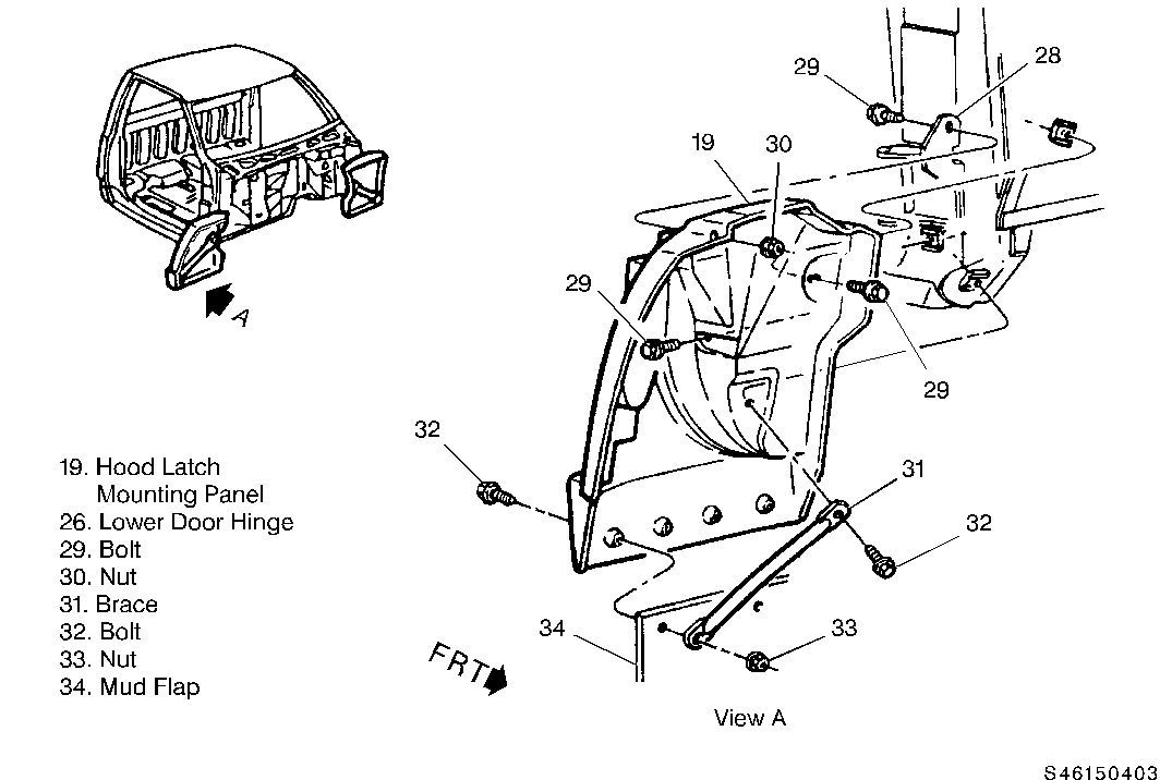 5. LOOSEN INBOARD BRACE BOLT INSIDE FENDER WELL ON "ELEPHANT EAR" PANEL (#32 ON FIGURE 3, VIEW A).