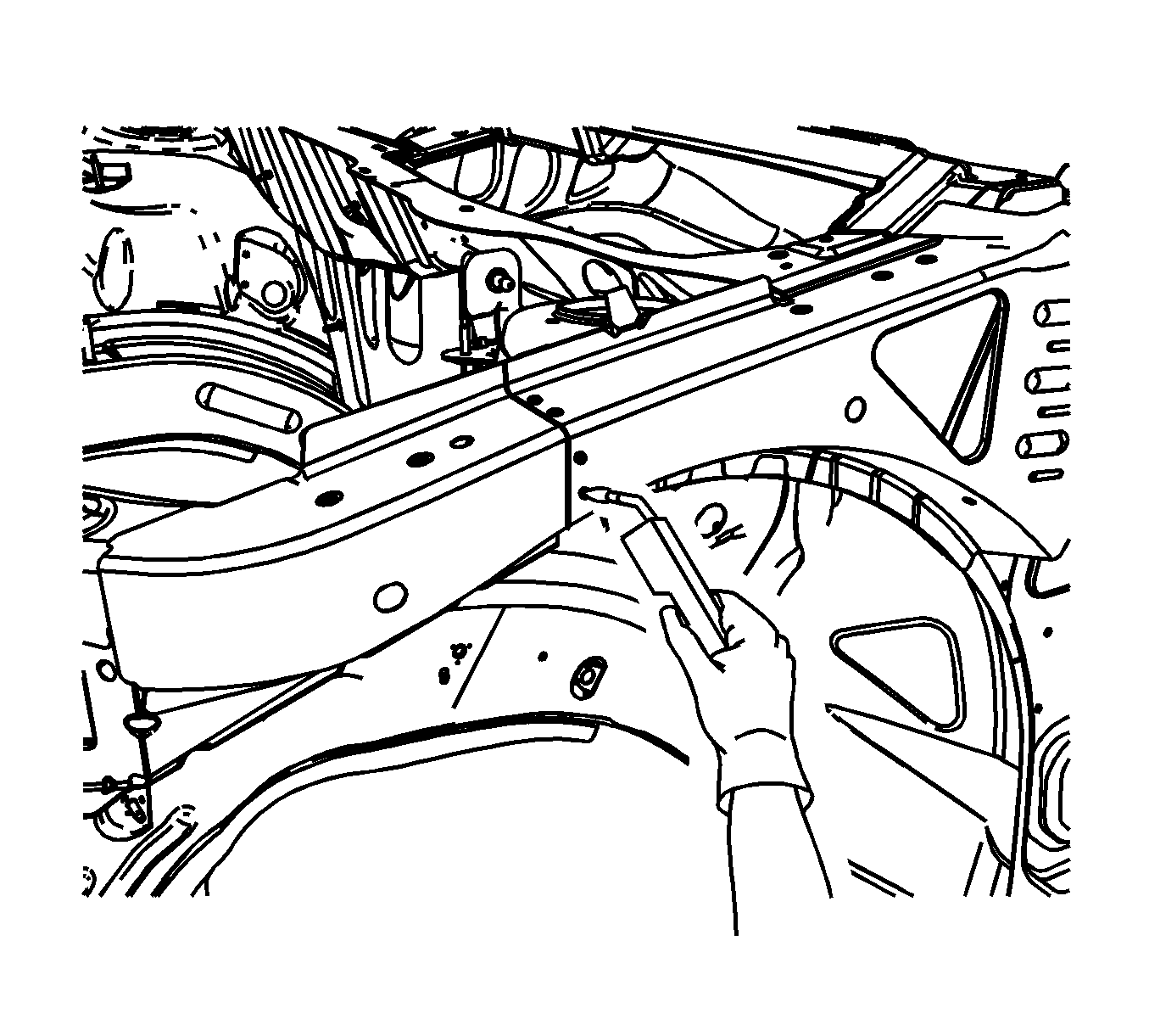 - Locate and drill out all spot welds on the upper side rail forward of the scribed line. Note the number and location of the spot welds for installation of the upper side rail.