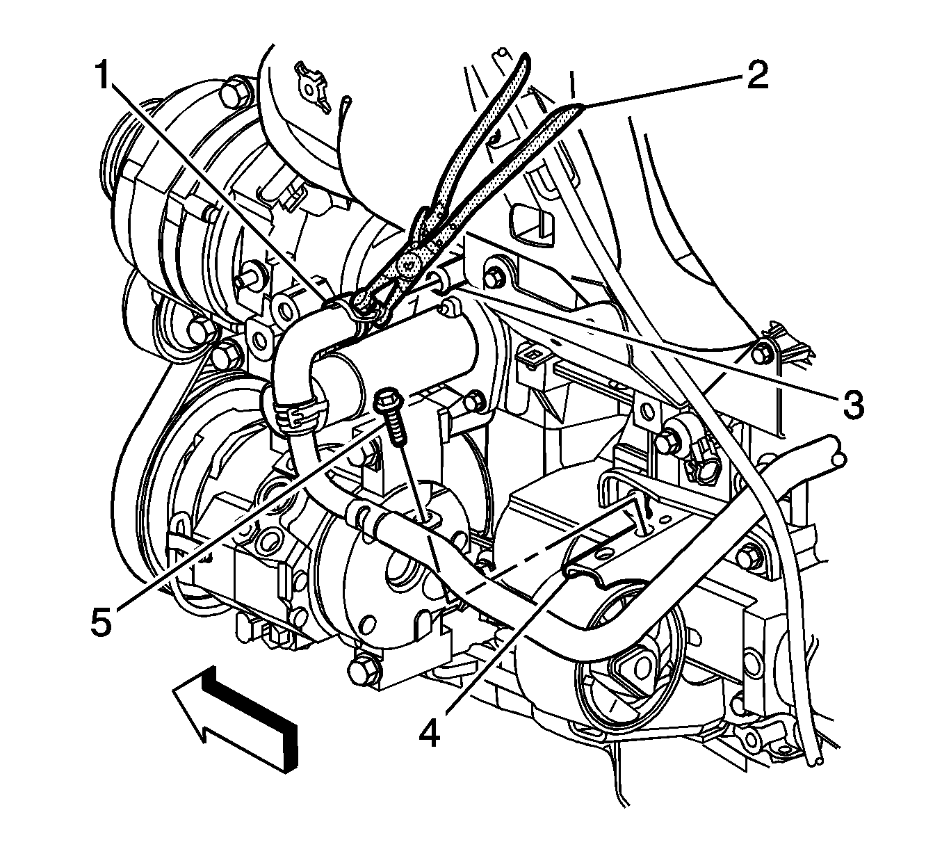 57. Install the bolt (5) securing the heater outlet hose/pipe to the left engine mount (4).