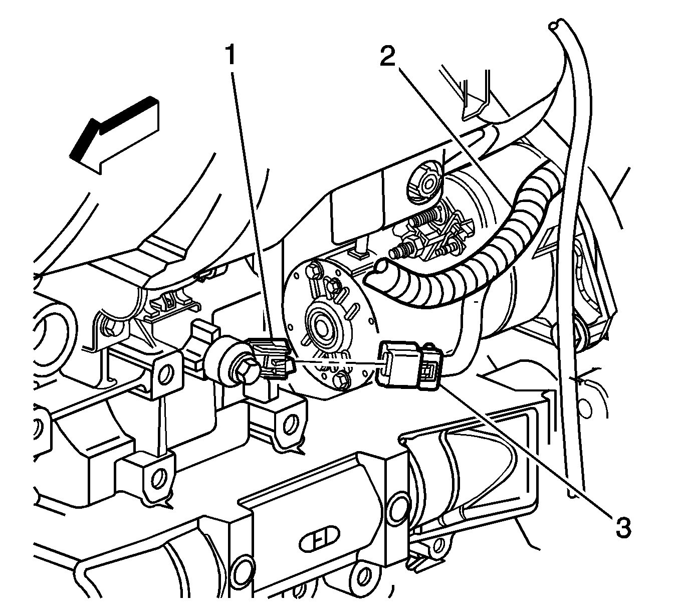 54. Connect the engine wiring harness connector (3) to the CKP sensor (1).