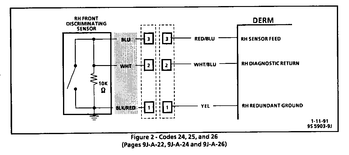 The wiring colors shown in the Service Manual are shown below under the heading OLD. The superceding information is shown under the heading NEW. A replacement page for page 9J-A-7, "SIR Wiring Schematic", is attached. Also, revised facing-page art is attached. Facing-page Figure 1 applies to Codes 14, 15 and 16; Figure 2 applies to Codes 24, 25 and 26.