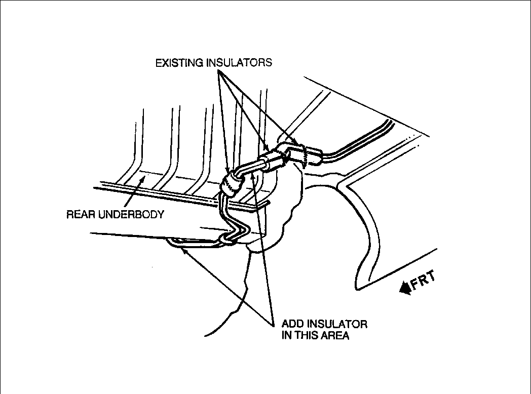 UNDERBODY - FUEL LINE 1. RATTLE BETWEEN FUEL LINE 1. IF NECESSARY, CORRECTLY POSI- AND REAR OF UNDERBODY. TION INSULATOR. ADD ADDITIONAL INSULATOR P/N 10157933 AND STRAP P/N 3816659. SEE FIGURE 5.