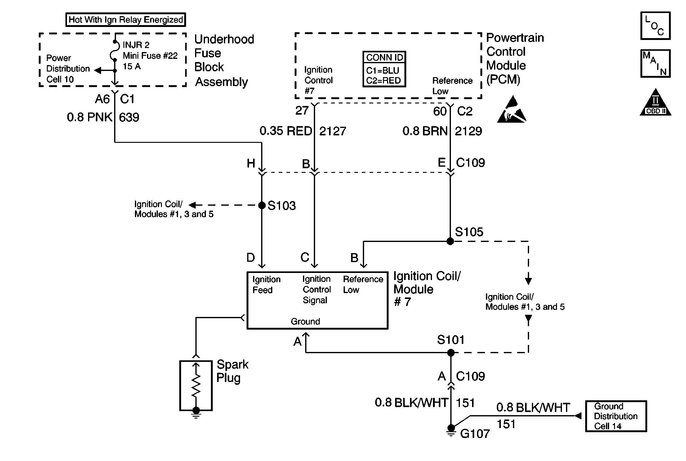 The ignition system on this engine uses an individual ignition coil/module for each cylinder. The PCM controls the ignition system operation. The PCM controls each coil using one of 8 ignition control (IC) circuits. The PCM commands the IC circuit low when a spark event is requested. This causes the IC module to energize the ignition coil to create a spark at the spark plug. Each ignition coil/module has the following circuits: