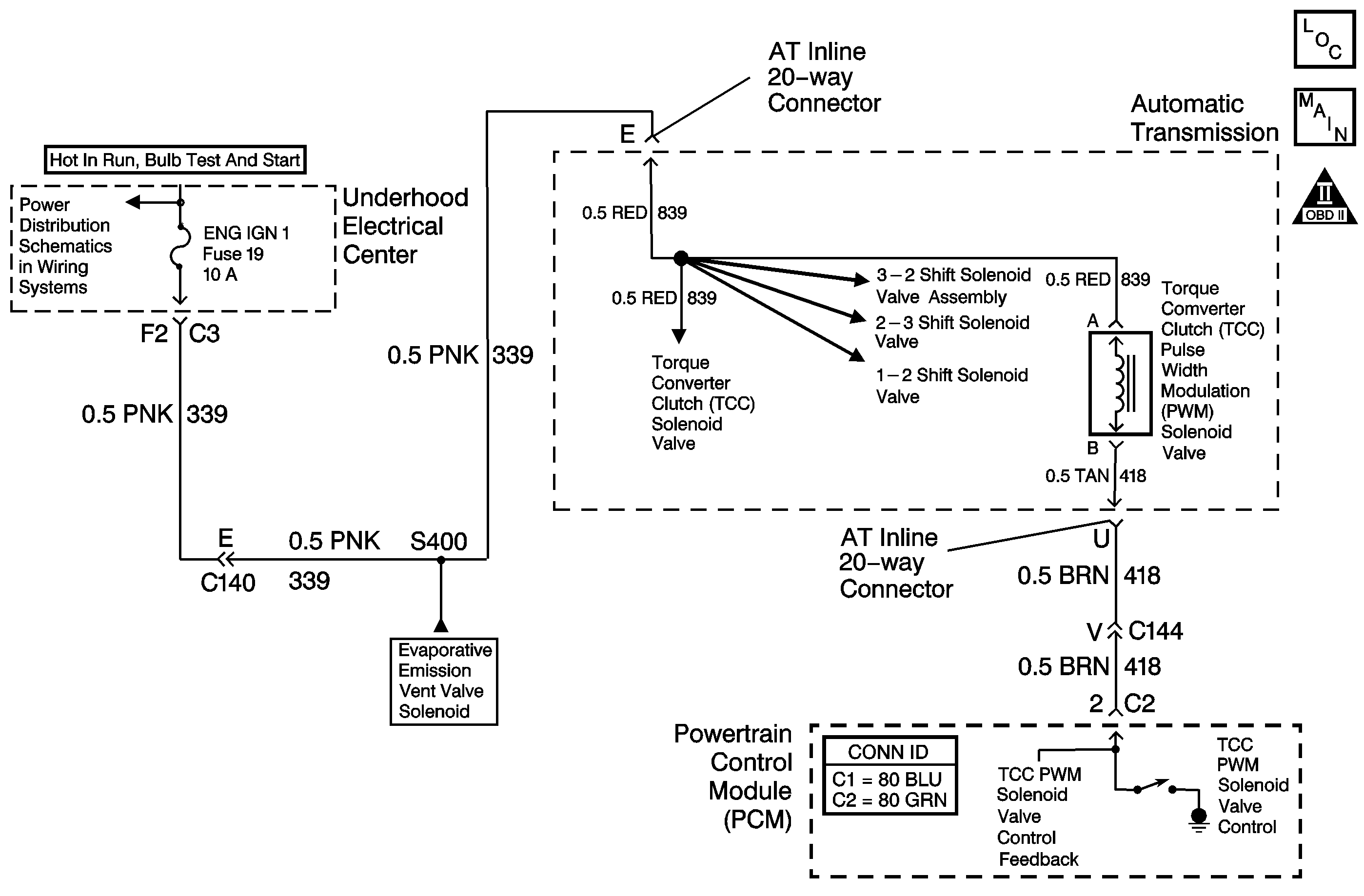 15 | Test the control circuit of the TCC PWM solenoid valve for a short to ground between the PCM connector C2 and the AT inline 20-way connector. Refer to Testing for Short to Ground and Wiring Repairs in Wiring Systems. Did you find and correct the condition? | -- | Go to Step 20 | Go to Step 19 | ||||||||