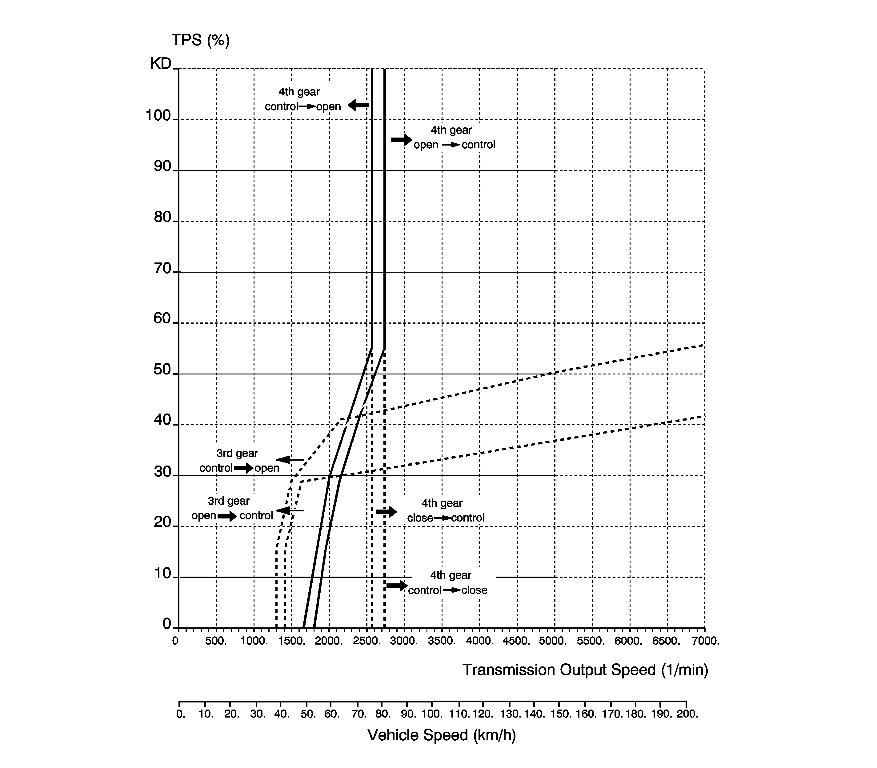 Model | Down Shift (±4.0 mph (6.4 km/h)) | Lock Up Clutch Applied (4th) | Lock Up Clutch Released (4th) | ||||