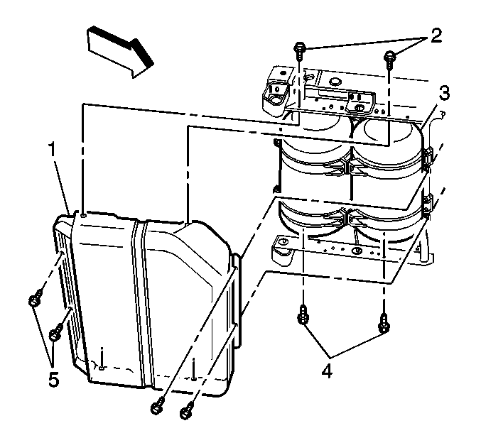 1. Remove the eight tank shield bolts (2,4,5) while an assistant holds the shield (1) in place.