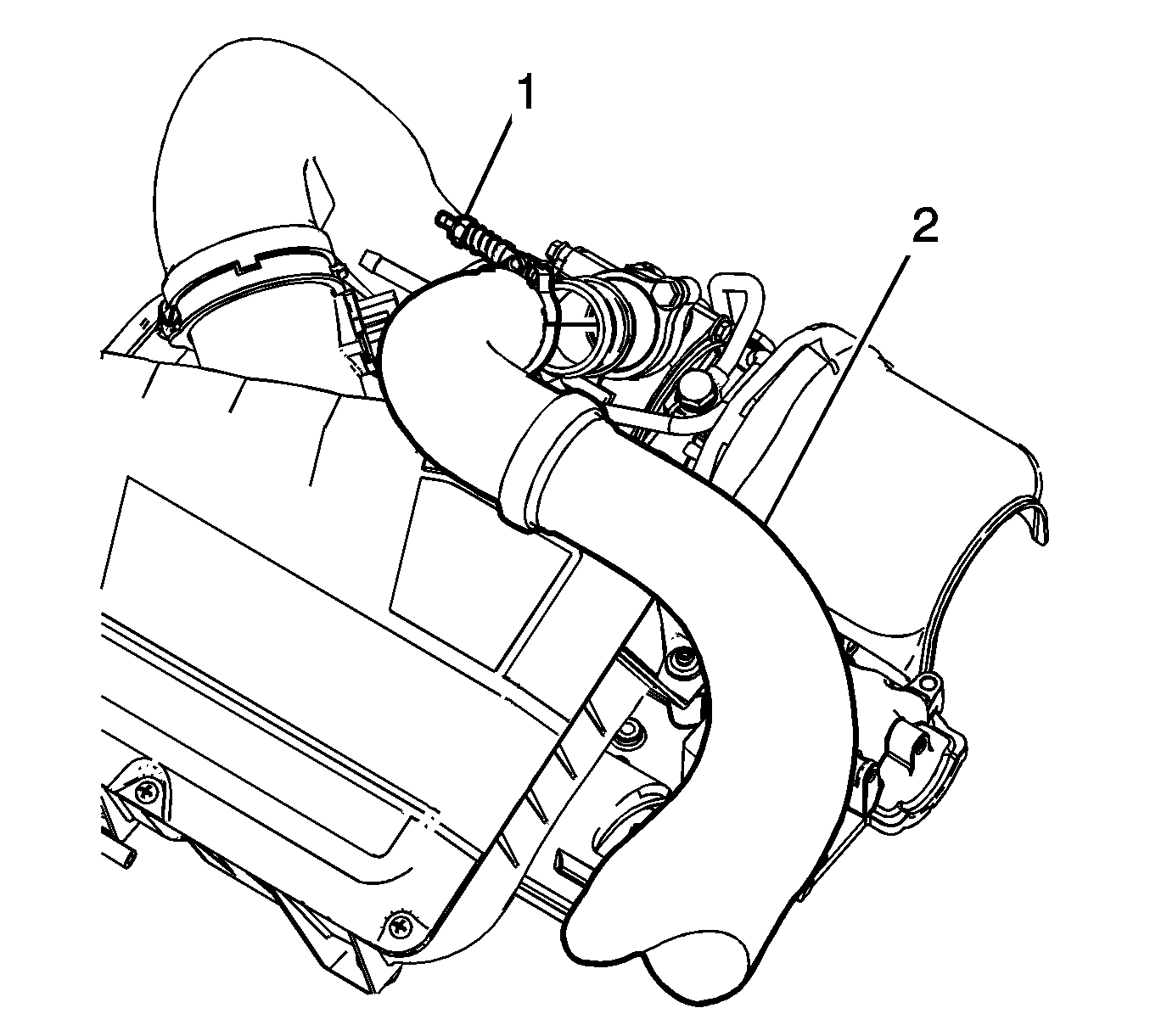 - Install the charge air cooler pipe (2) and tighten the charge air cooler inlet pipe clamp.