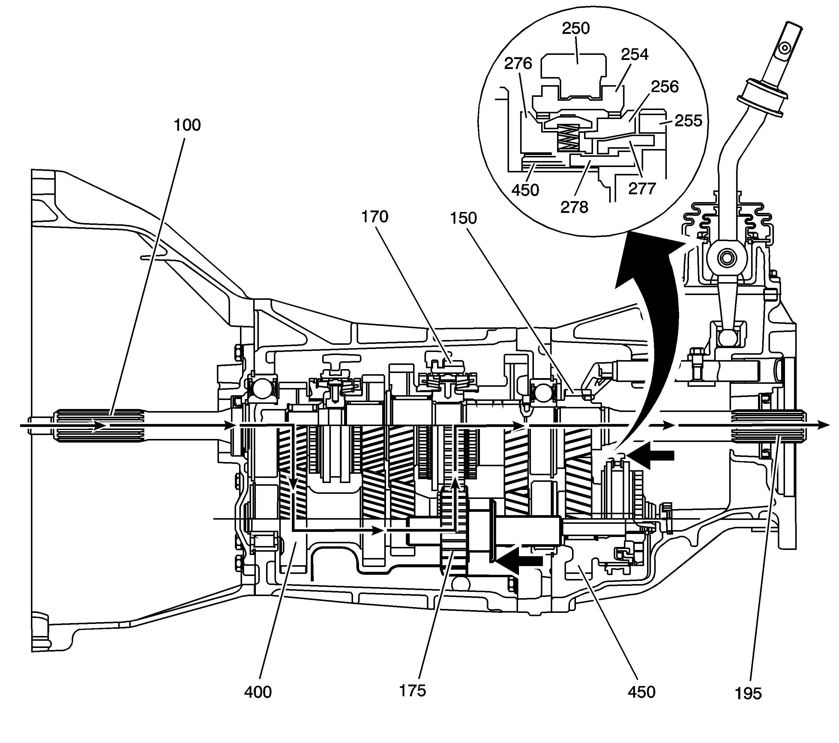 1st gear: Moving the 1st/2nd shift fork (210) rearward, moves the 1st/2nd synchronizer sleeve (170). The inner teeth on the synchronizer sleeve push against the blocking ring teeth, causing the synchronizer rings to contact, and the speed gear and the output shaft to match speeds. The synchronizer sleeve (170) then engages the selector teeth on 1st gear (110). Power flow is now from the input shaft (100) to the countershaft (400) to the 1st gear (110), through the synchronizer and to the output shaft (195).