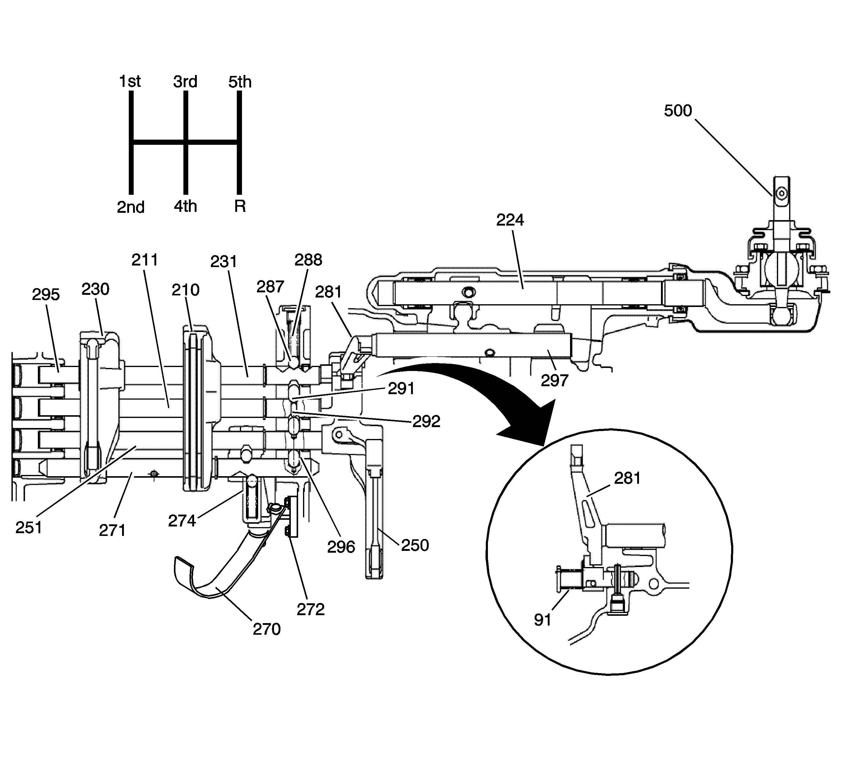 The AR5 has a unique shift system. A single shift control shaft (281) operates four shift shafts. The shift control lever (500) fits into a socket on the shift control shaft (281). Positioning the lever, or finger of the shift control shaft (281), in the gates of the shift shafts, operates the 1st/2nd shift shaft (211), the 3rd/4th shift shaft (231) and the 5th shift shaft (251). Moving the shift control lever (500) side-to-side allows the lever on the shift control shaft (281) to engage into one of the three gates. Moving the shift control lever (500) forward and reverse selects either position of the particular shift shaft. The 3rd/4th shift shaft (231) is the top shift shaft. A bolt holds the 3rd/4th shift fork (230) in place on the shift shaft. When shifted in position, a detent ball (287) and spring (288) located in the top of the intermediate case, holds the shift shaft. The 1st/2nd shift shaft (211) is the second shaft from the top. A bolt holds the 1st/2nd shift fork (210) in place on the shift shaft. In addition, the 1st/2nd shift fork (210) slides on the 3rd/4th shift shaft (231). Using two shift shafts for the shift fork, keeps the shift fork square to the synchronizer sleeve. A small shift shaft interlock pin (292) in the 1st/2nd shift shaft (211) prevents the other shafts from moving. Interlock pins (291), located in the intermediate case on either side of the 1st/2nd shift shaft (231), contact the small interlock pin (292) and lock into a notch on the shift shafts, preventing multiple shift shaft movement. The 5th shift shaft (251) is located third from the top. A roll pin holds the 5th shift fork (250) in place on the shift shaft. In addition, on the 5th shift shaft (251) is the reverse shift lever (274). The reverse shift shaft (271) is the bottom shift shaft. The shift shaft does not move. An interlock pin, in the intermediate case, holds the shaft in place. Instead, the shift shaft has detents for the detent ball and spring located in the reverse shift lever (274). When moving the 5th shift shaft (251) forward, the retaining clip at the rear of the reverse shift lever (274) moves the reverse shift lever (274). The reverse shift fork (270) swivels on the reverse shift lever (274). The reverse shift fork (270) pivots on the reverse shift fork bracket (272) in order to increase the movement of the reverse shift fork (270). To help prevent a mis-shift to the reverse position, a reverse restrictor (91) is located in the extension housing. When going into reverse, a finger on the shift control shaft (281) contacts the plunger on the reverse restrictor (91). Compressing the spring gives the driver a restricted feel when shifting to reverse. Detent balls and springs hold the 1st/2nd shift shaft (211) and the 5th shift shaft (251) in the shift positions. On the right side of the intermediate case are the detent plugs for accessing the detent balls and springs. Even though there is a detent plug for the reverse shift shaft (271), no detent spring and ball is located there. To aid in easy shift operation, the front case shift shaft bushings (295) and the intermediate case shift shaft bushings (296) support the 1st/2nd shift shaft (211), the 3rd/4th shift shaft (231), and the 5th shift shaft (251). Supporting the shift control shaft (281) at each end are the extension housing shift shaft bushings (297).