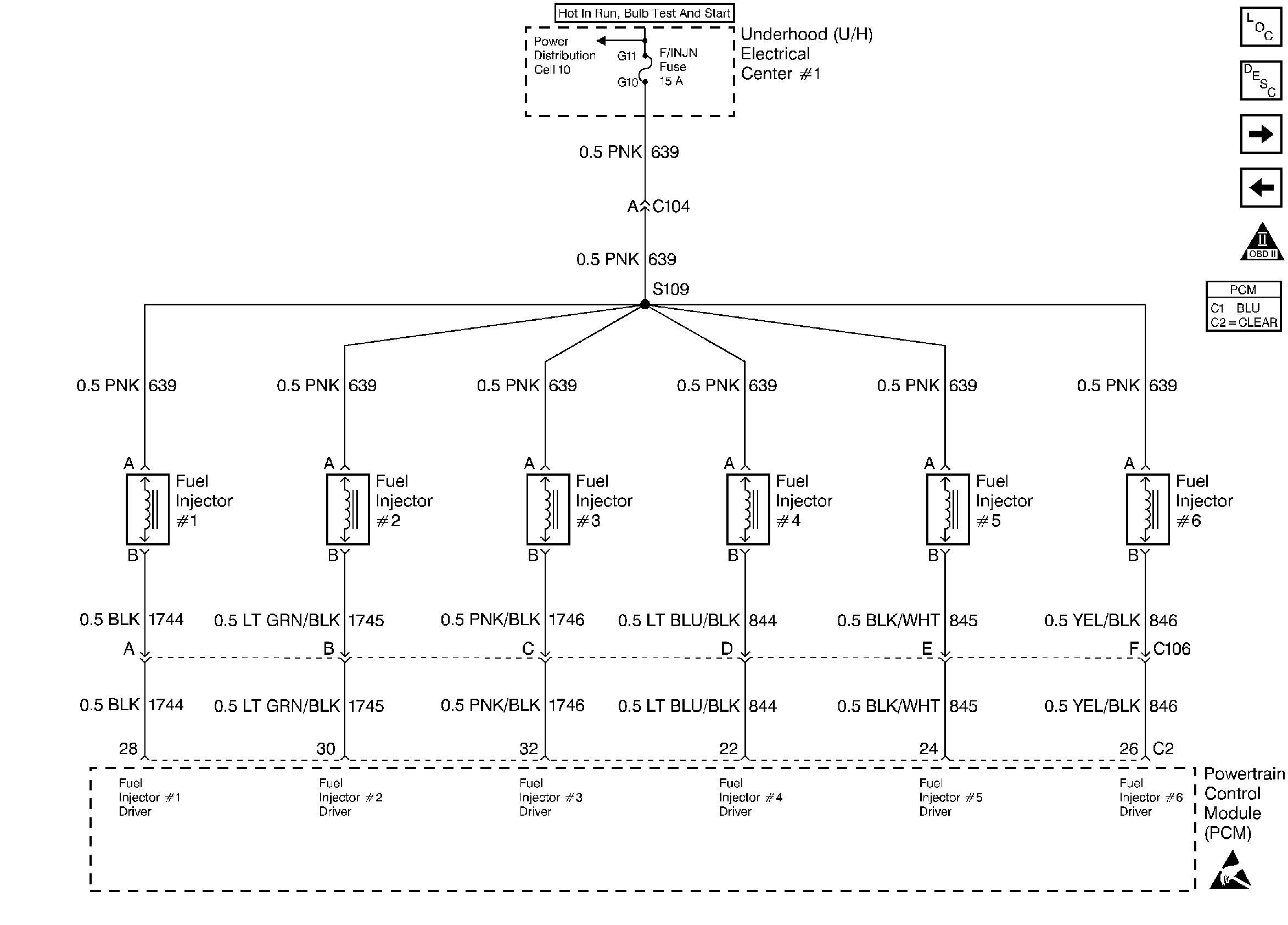 The PCM controls the fuel injector control circuit using a General FET Driver (GFD). The GFD has the ability to detect an electrical malfunction on any of the injector ignition feed or control circuits. If an electrical malfunction is detected, the GFD signals the PCM to set DTC P1200.