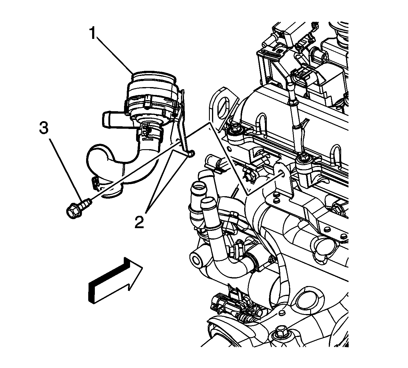 - Remove the exhaust manifold heat shield bolt (3) securing the heater coolant pump bracket.