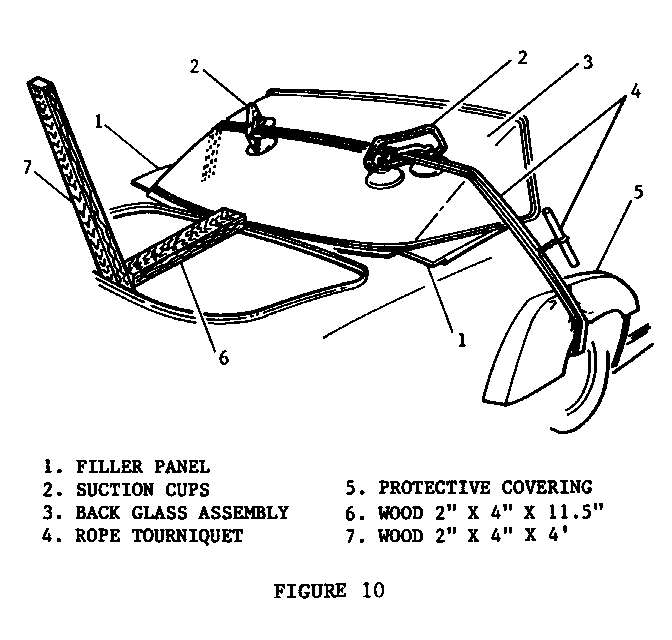 8. Attach a piece of nylon rope (1/2" diameter x 21' long) or equivalent to the rear axle or route through the rear wheel openings. Secure back glass by constructing a rope tourniquet as shown in Figure 10.