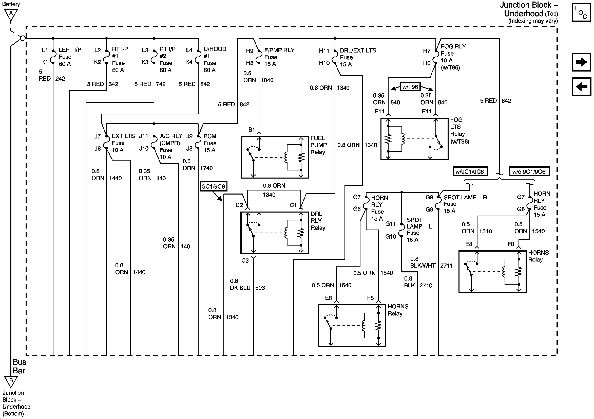 AUX PWR, BRK SW, C/LTR, DRL/EXT LTS, HAZ SW, HVAC BLO, RT I/P#2, Spot Lamp-Left, and Spot Lamp-Right Fuses, DRL RLY Relay