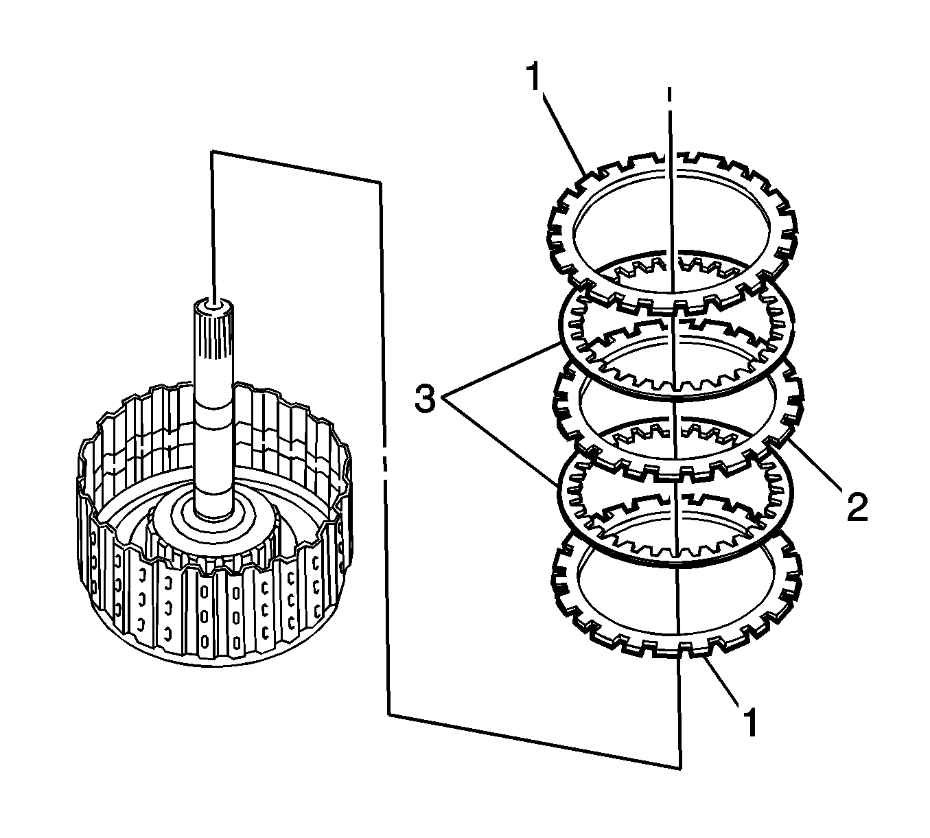 13. Remove the flange (1), 3 discs (3), and 3 plates (2) from the forward clutch drum.