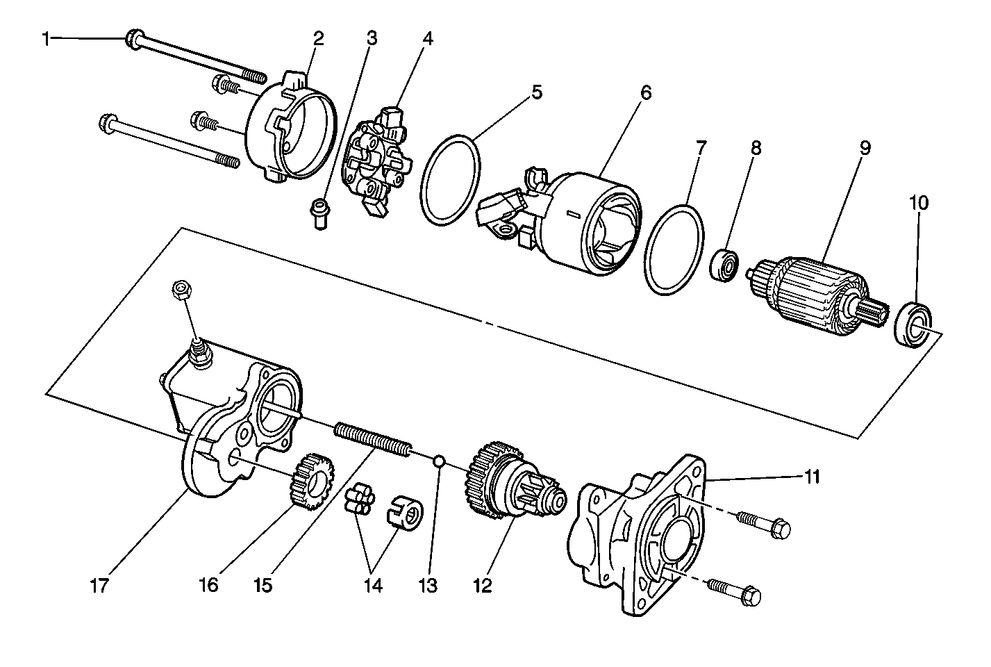 The repairable starter motors have pole pieces that are arranged around the armature. Both solenoid windings are energized. The pull-in winding circuit is completed to ground through the starter motor. The windings work together magnetically to pull and hold in the plunger. The plunger moves the shift lever. This action causes the starter drive assembly to rotate on the armature shaft spline as it engages with the flywheel ring gear on the engine. Moving at the same time, the plunger also closes the solenoid switch contacts in the starter solenoid. Full battery voltage is applied directly to the starter motor and it cranks the engine.