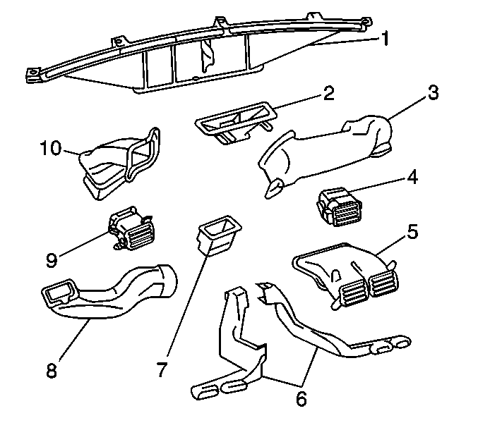 Remove the windshield defroster nozzle duct (2) from the heater case assembly.