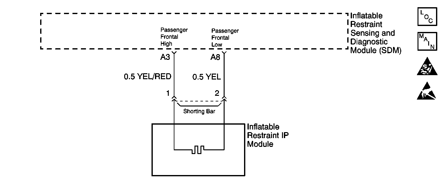 A short to B+ or short to ground in the inflatable restraint IP module circuit can cause an intermittent condition. Inspect the passenger frontal high circuit and the passenger frontal low circuit carefully for cutting or chafing. Wiring pigtail damage requires replacement of the inflatable restraint IP module.