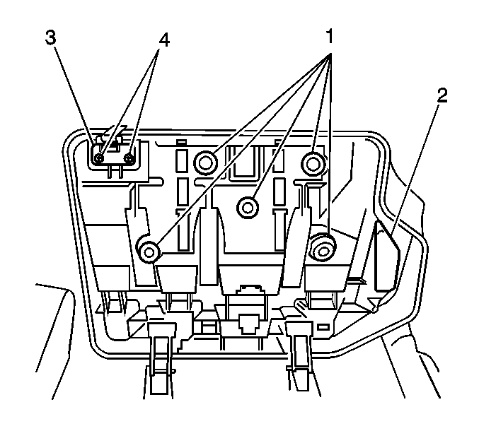 1. Raise the rear seat cushion (2) in order to gain access to the rear seat pull strap retaining screws (4).