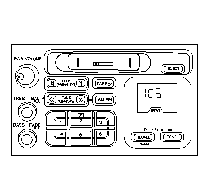 In order to adjust the bass, depress and release the BASS/FADE control knob to the out position. Turn the knob clockwise to increase the bass. Turn the knob counterclockwise to decrease the bass. In order to adjust the treble, depress and release the TREB/BAL control knob to the out position. Turn the knob clockwise to increase the treble. Turn the knob counterclockwise to decrease the treble. After either adjustment, depress and release the knob in order to return it to the in position.