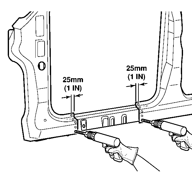 7. Drill 8 mm (5/16 in) plug weld holes along the sectioning cut on the remaining original part. Locate these holes 25 mm (1 in) from the edge and spaced 40 mm (1.5 in) apart.