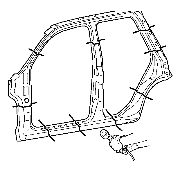 8. Perform additional sectioning procedures. Refer to Outer Door Frame Sectioning - Windshield Pillar , Rocker Panel Sectioning , Front Hinge Pillar Sectioning and Rear Pillar Sectioning .