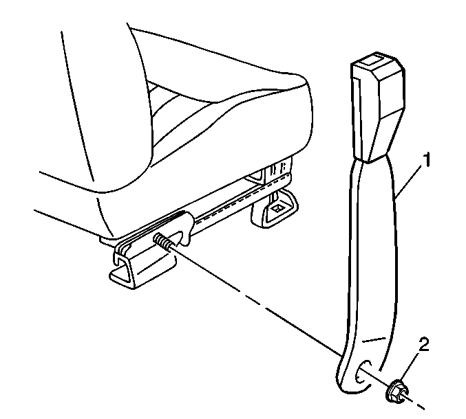 3. Install the nut (2) securing buckle side belt (1) to the seat cushion frame.