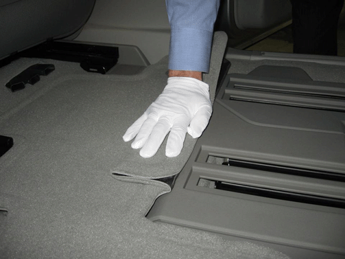 With the launch of the all new Buick Enclave, GMC Acadia and Saturn Outlook, it is important that our customers experience the highest quality with their vehicle upon delivery. With that said, an all new "Smart Slide" seat feature is utilized for the second row seating. This seat feature allows easy access to the third row seating by allowing the second row seat to slide forward with minimal effort. When incorporating the "Smart Slide" seats along with the OEM floor mats, the seat may seem difficult to operate or bind on the floor mat. It is important that during the PDI process, the floor mat is folded per the directions below to prevent any difficulty when using the "Smart Slide" seat feature.