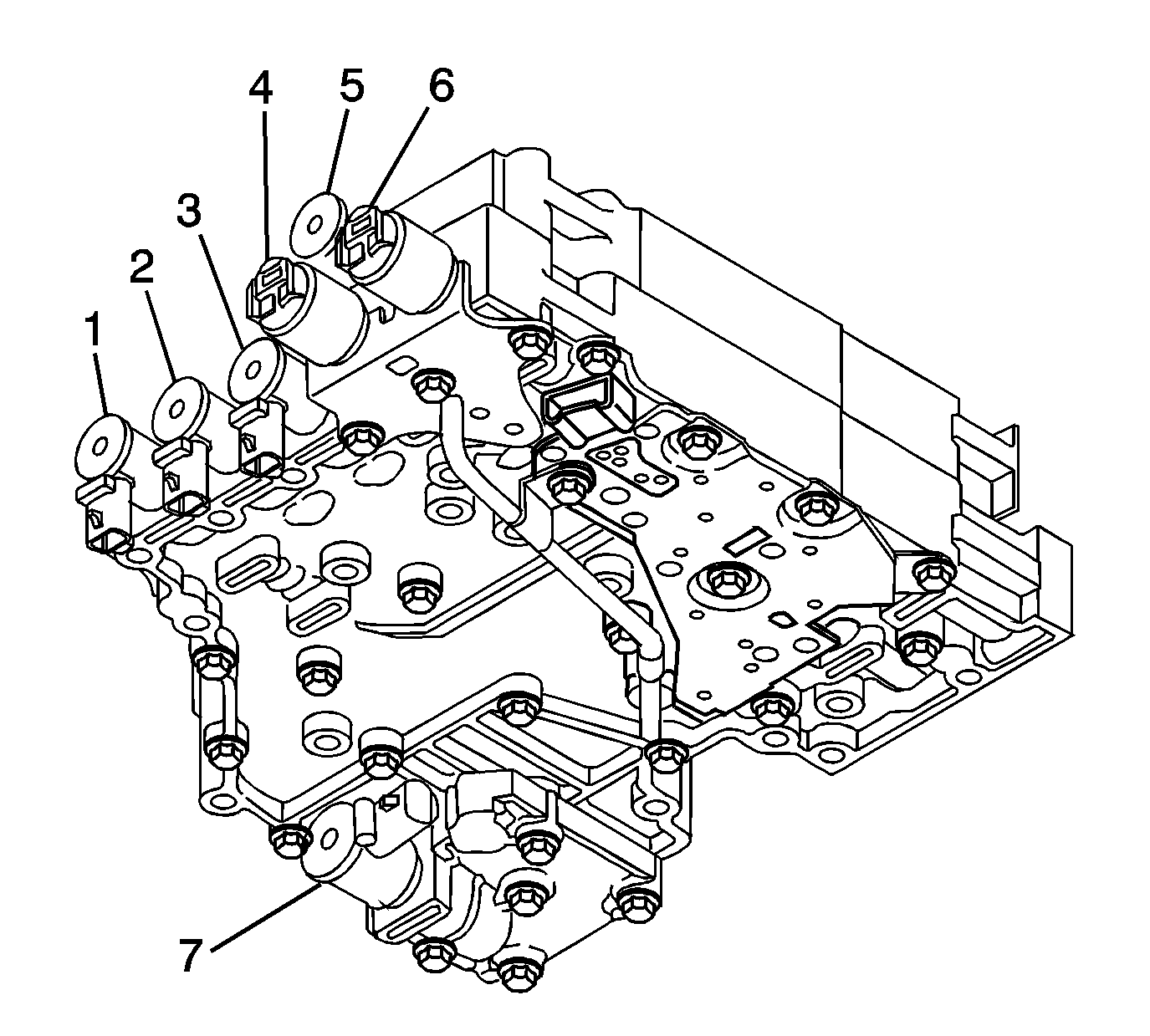Modulated main pressure solenoid (7) is a normally closed solenoid used to modulate the transmission main pressure. Under specific conditions, such as low throttle setting, low engine torque, low engine speed, and low transmission output speeds, the transmission control module (TCM) commands the solenoid on. When the solenoid is applied, fluid is routed to the main pressure regulator valve; this in turn reduces the main pressure schedule and improves the volume of oil through the overage circuit. By modulating main pressure, the cooler flow at idle can be increased allowing improved cooling and reducing transmission pump noise.