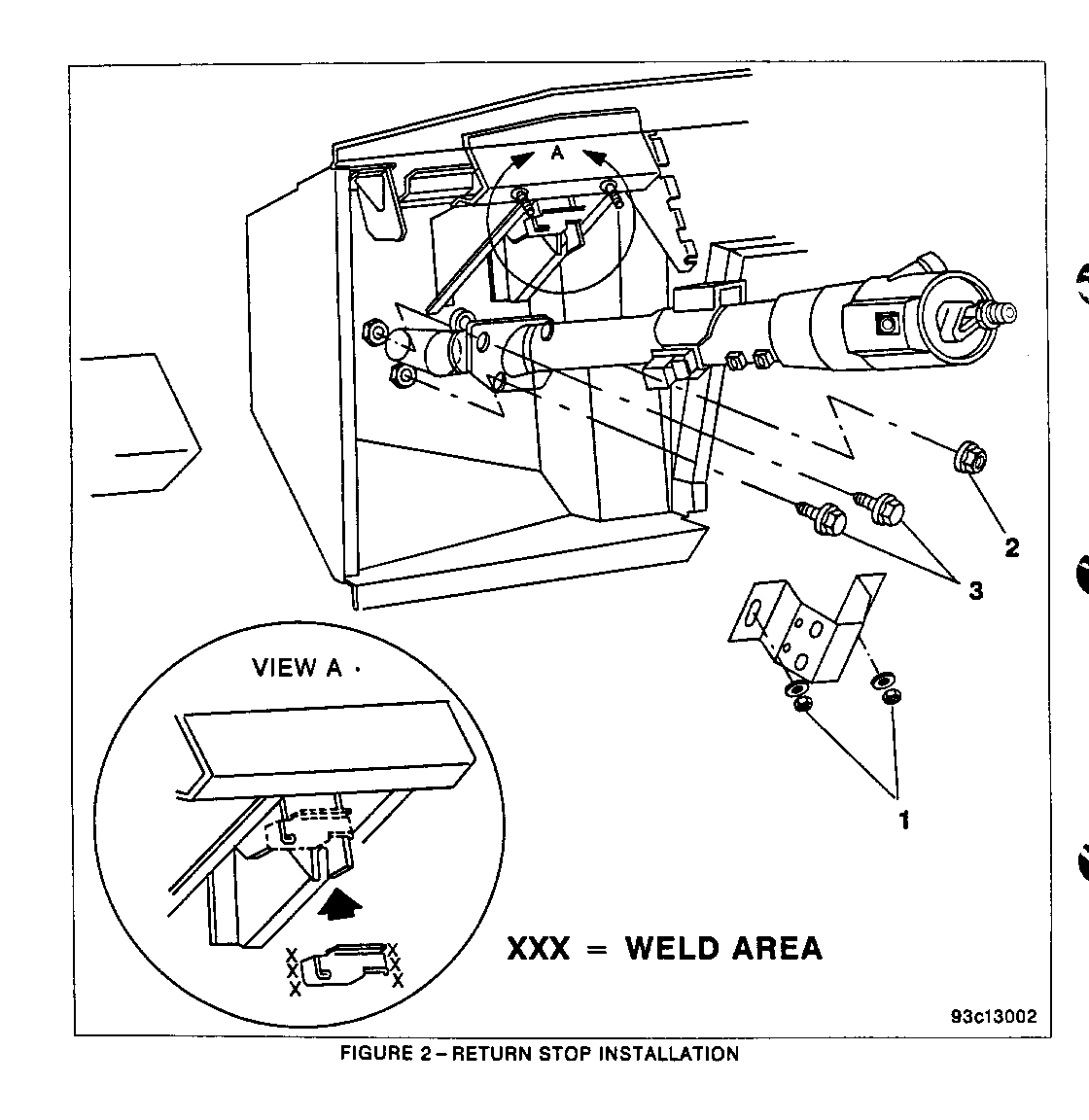 7. WELD NEW STOP BRACKET IN POSITION WITH WELDS AT EACH END. (THE WELD AREA IS MARKED ON FIGURE 2, VIEW A WITH "XXX"). WELD SPECIFICATIONS ARE 3.0 V 15.0 ~(WA, WHICH ACCORDING TO AMERICAN WELDING SOCIETY IS A WELD OF 3 MM THICKNESS (ABOUT 1/8 INCH THICK) B 15 MM LENGTH (ABOUT 1/2 INCH LONG), USING A 70 SERIES STEEL ELECTROD