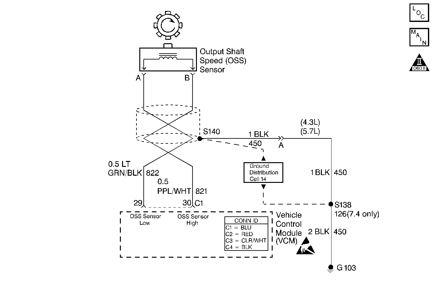 The output shaft speed sensor (OSS sensor), which is a permanent magnet (PM) generator, provides the vehicle speed information to the vehicle control module (VCM). The PM generator produces a pulsing AC voltage as the transmission speed sensors rotor teeth pass through the sensor's magnetic field. The AC voltage level and the number of pulses increase as the speed of the vehicle increases. The VCM then converts the pulsing voltage to a digital signal for vehicle speed. The vehicle speed is used for engine and transmission calculations.