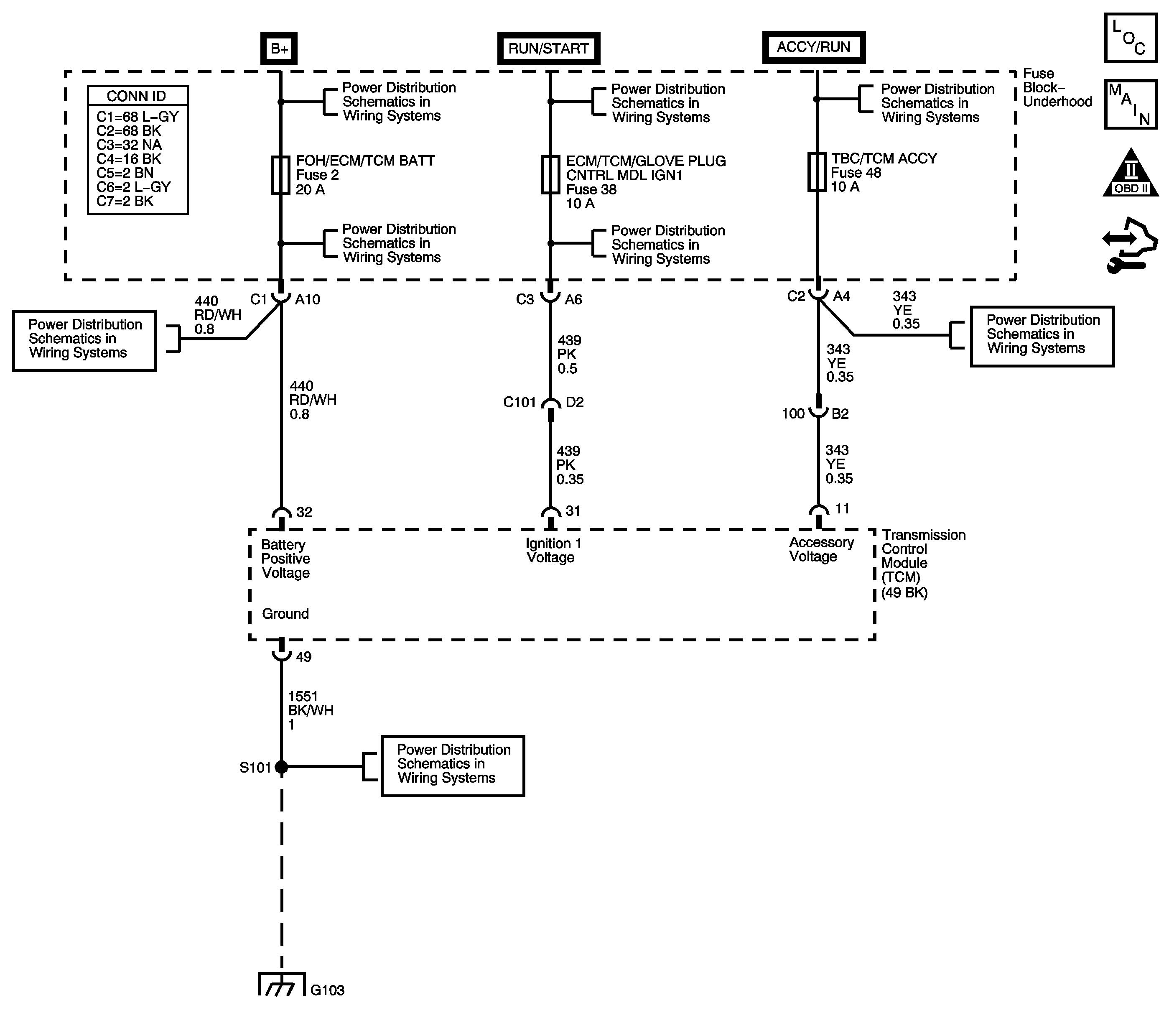 The transmission control module (TCM) continuously monitors the system voltage on the Ignition 1 and the battery voltage circuits. Lower than normal voltage may be inadequate to operate the transmission control solenoids properly. Improper solenoid operation may cause erratic transmission operation and tie-up conditions, which may result in internal damage.