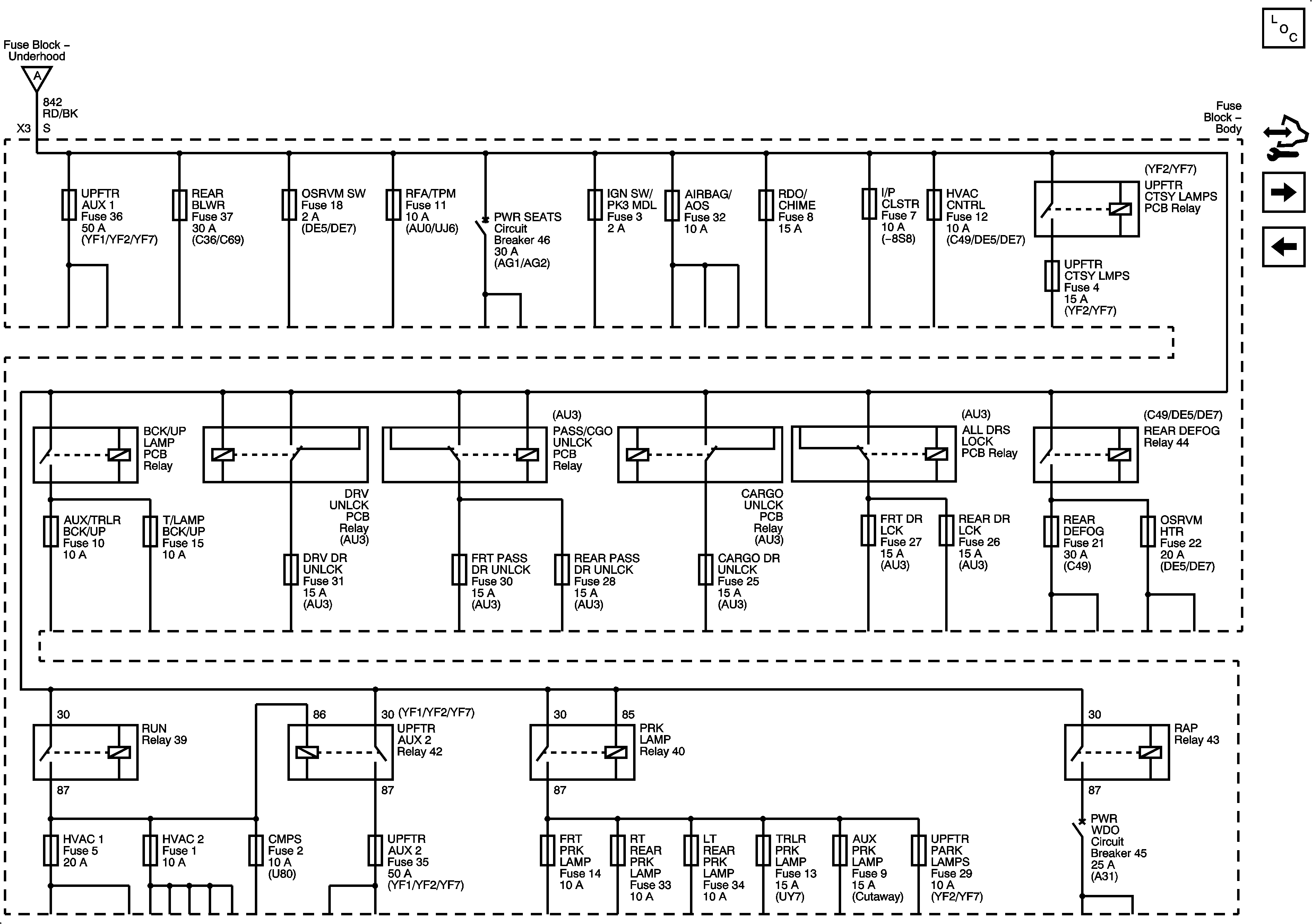BCM 1-7, AUX PWR OUTLET, LTR/DLL, FRT BLWR, TRLR WRG and FOH MDL Fuses
