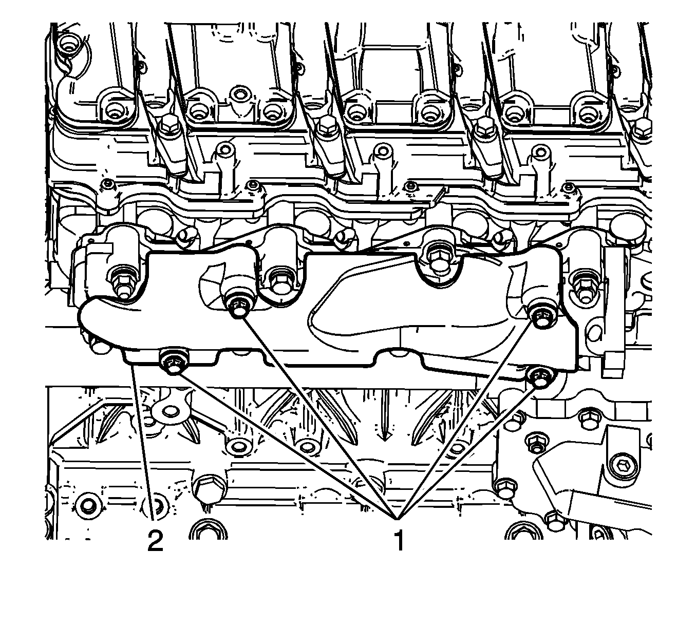 9. Position the exhaust manifold heat shield (2) to the manifold and install the bolts (1).
