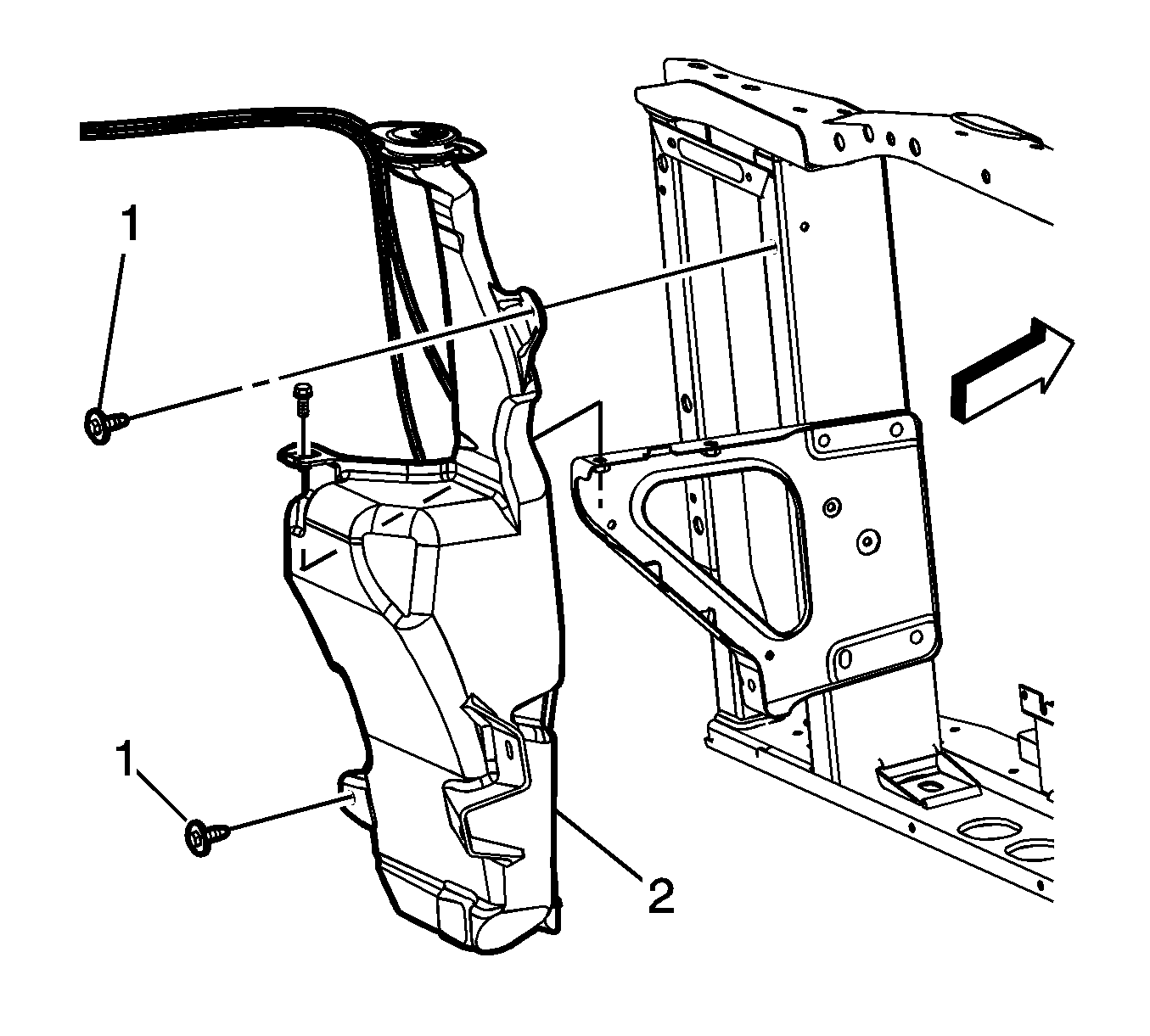 Important: Remove the washer container from the underside of the vehicle through the wheelhouse opening.