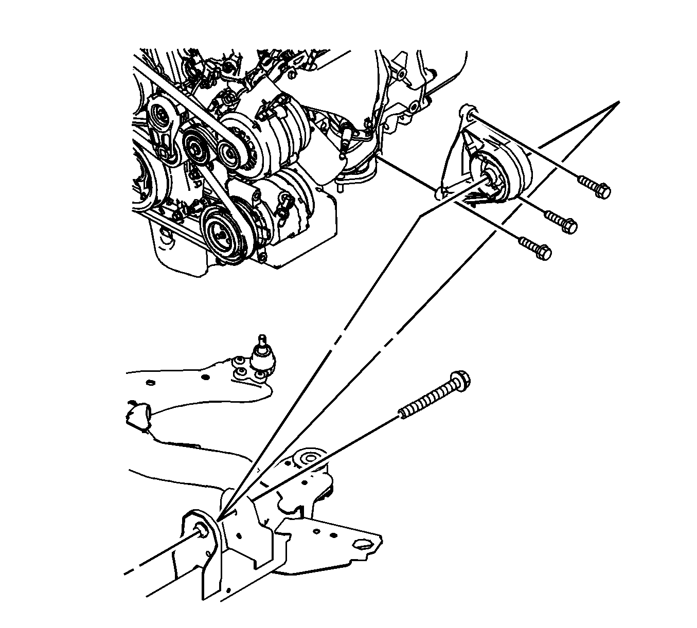 Important: Before tightening the transaxle front mount through bolt swing the engine assembly backwards and forwards or from the side to side for the proper alignment.